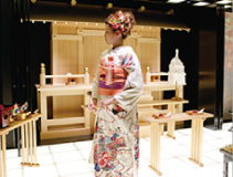 ブラックをベースにしたコンテンポラリーなデザインが、伝統とモダンの調和を奏でる「Four Seasons〜四季の社〜」 祭壇サイドの巨大スクリーンには春夏秋冬ごとの風景が映し出されます。