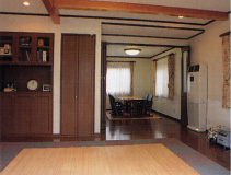 天然木無垢材を生かした新築物件です。リビングは、無垢の梁をあしらい和洋折衷の広い空間に仕上げ、外壁は砂岩調サイディングとジョリパット塗りの2色使いに黒のM字をプラスした個性的住宅です。